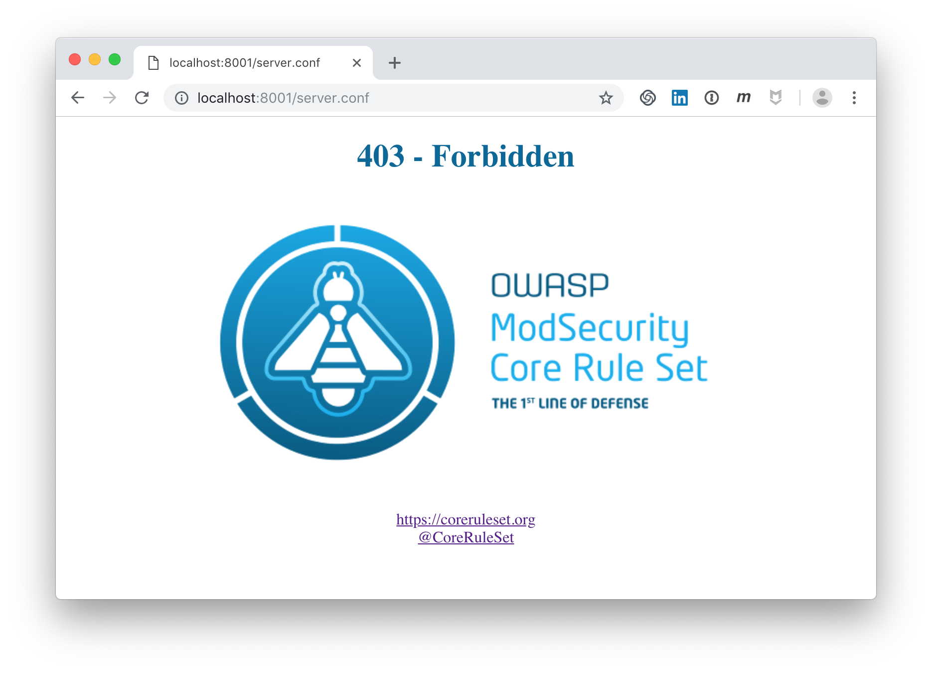 - CRS rule 920440 now states that our configured file extension .conf is not allowed: